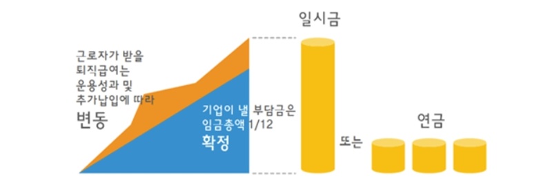 ✅ 확정기여형(DC형; Defined Contribution) - 사용자가 납입할 부담금이 매년 근로자 연간 임금총액의 1/12로 사전에 확정된 퇴직연금제도로, 근로자는 직접 자신의 퇴직연금 적립금을 운용하여, 적립금와 운용수익을 퇴직급여로 지급받습니다.