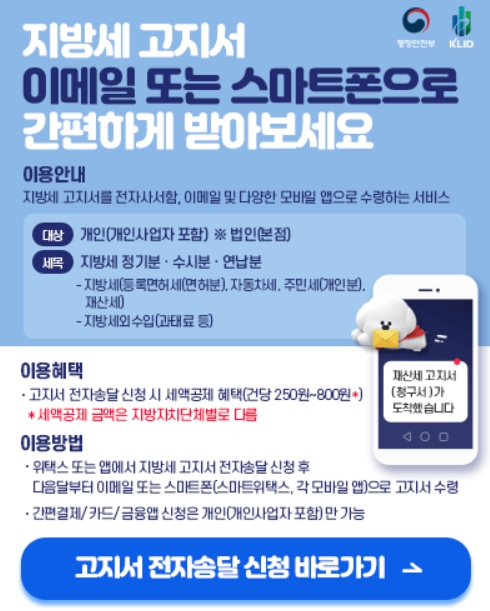 종이고지서로 받는 대신에 이메일, 전자사서함, 모바일 앱으로 받는다면 환경도 생각할 수 있고, 고지서를 분실하거나 납부기간을 잊게 되어 가산세를 납부하는 등의 불상사를 예방할 수 있을 것입니다.