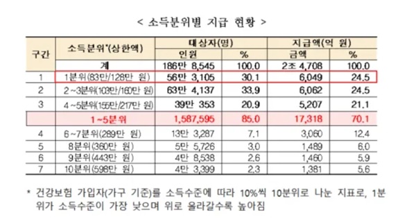지난해 기준 소득 1 분위 (직장가입자 건보료 월 5만 2850원 이하)의 본인부담 상한액은 연간 83만 원입니다. 소득 수준이 올라갈수록 상한액 규모는 커지고 가장 높은 소득 10 분위의 상한액은 598만 원입니다.