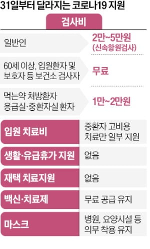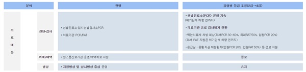 먹는 치료제 처방 대상 군, 응급실·중환자실 재원환자 등 고위험군이 신속하게 검사와 치료를 받을 수 있도록 검사비 일부 지원은 지속한다. 위기단계 하향 전까지 선별진료소 운영은 지속한다.