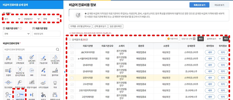 세부 정보를 클릭하면 가격정보가 나오고, 다른 병원과 가격비교까지 할 수 있어서 편리합니다.